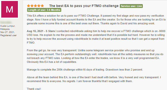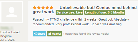 La logique impeccable de nos bots leur permet de calculer le mouvement du marché, de maintenir le drawdown le plus bas possible et de réaliser le gain financier maximum avec un haut degré de probabilité. Et surtout, les bots FTMO sont entièrement automatisés et ne nécessitent aucune configuration.